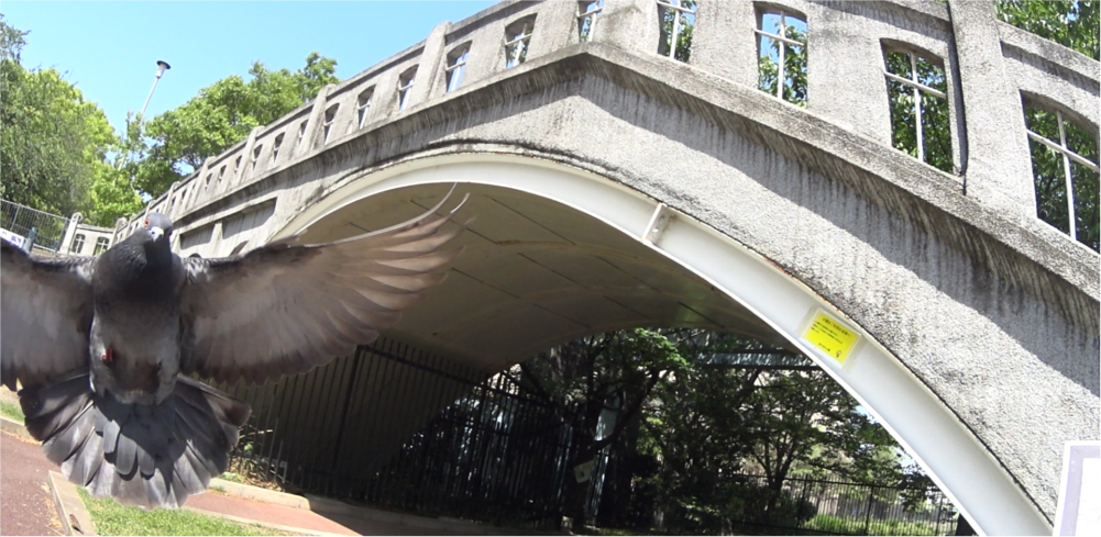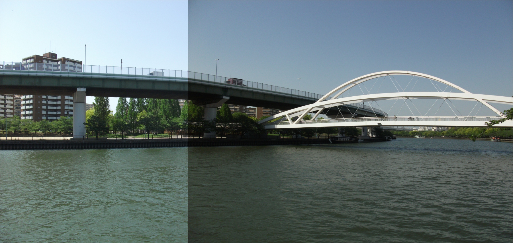 「飛翔橋」 大阪市都島区と北区の間に架かる歩行者専用橋。阪神高速道路の下をくぐる関係上、二重アーチ構造になっている。