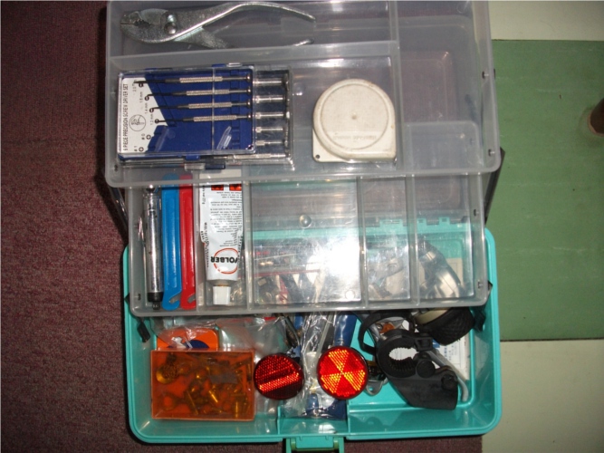 乾かす間に他の工具入れも一度全部出して拭き取ることにした。そして、バイクのおまけに付いてきた使わない工具をまとめて収納することにした。