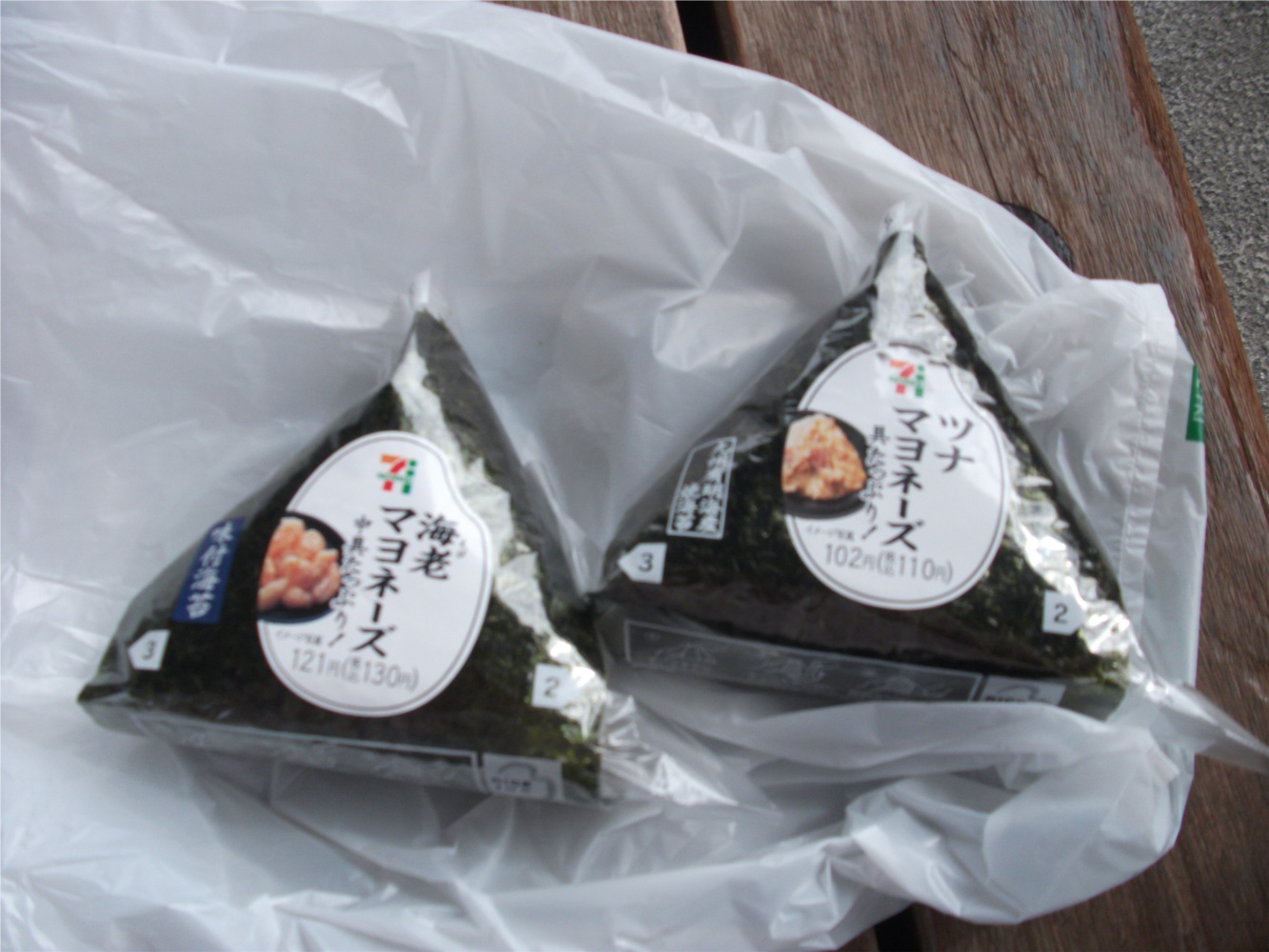 西天満のセブンイレブンでおにぎり2個購入、お茶は家から持参。