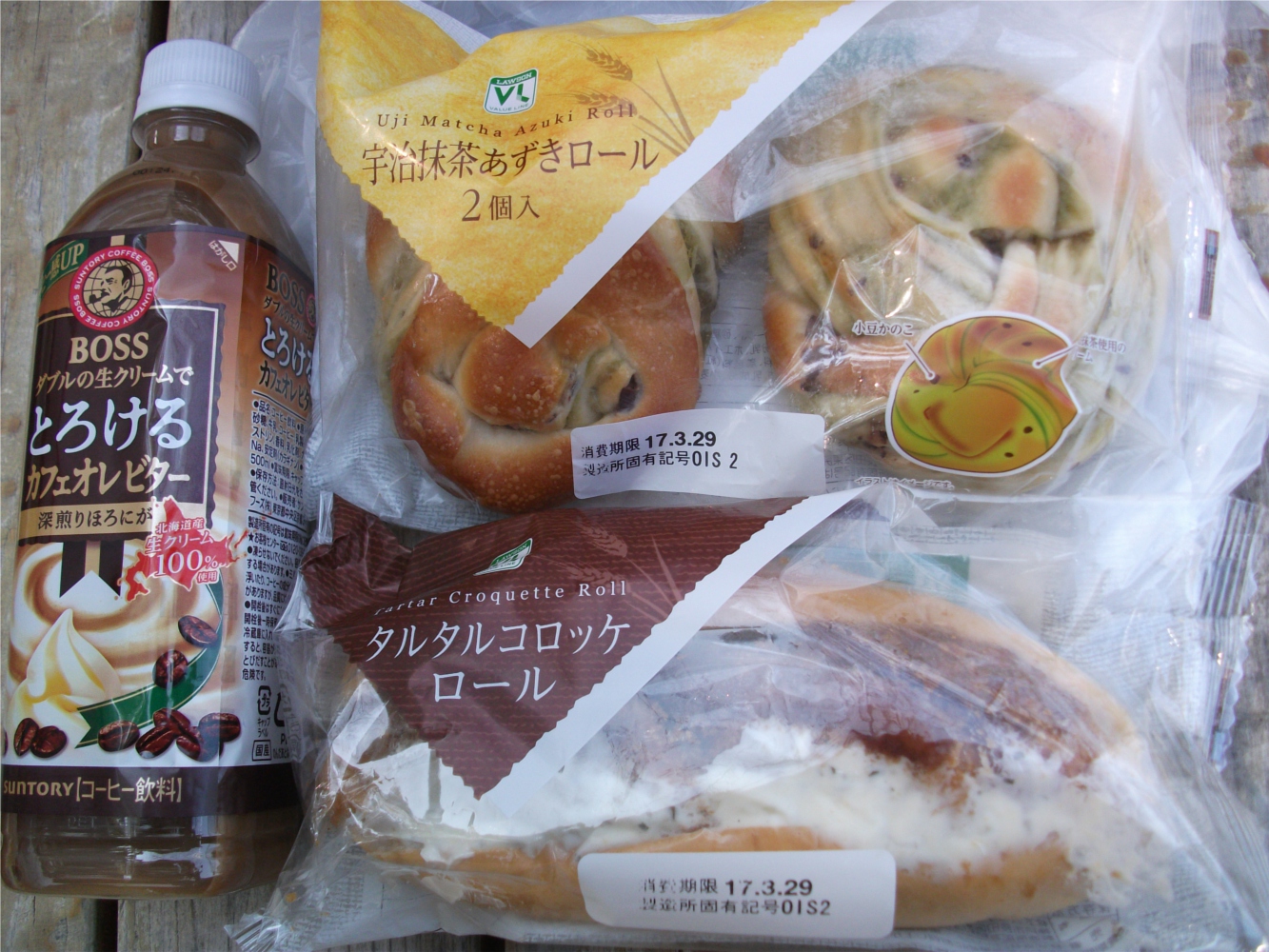 ということで、到着間際に購入を考え土佐堀通り北浜付近のファミマでパン2個と温かいコーヒー購入。